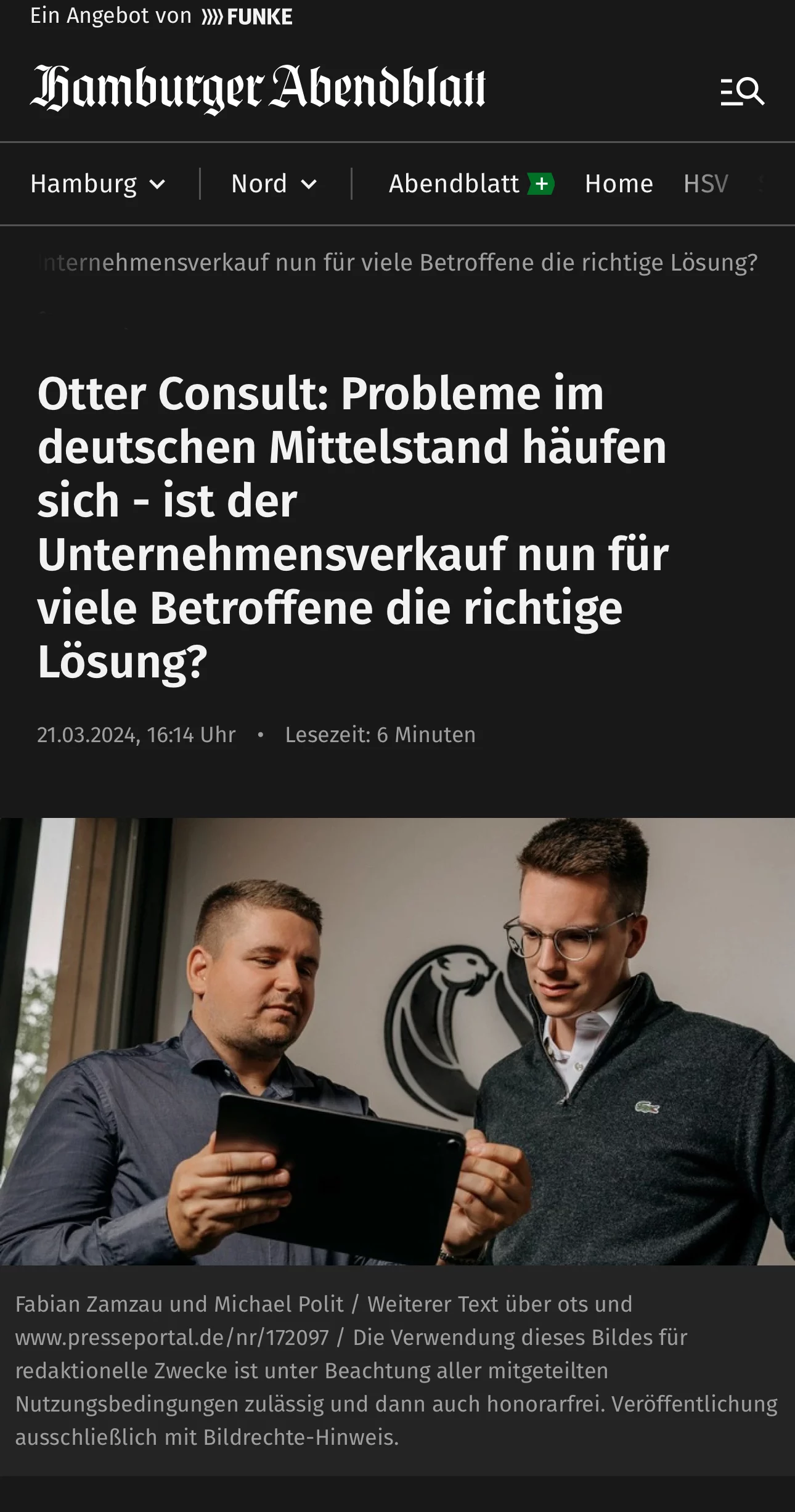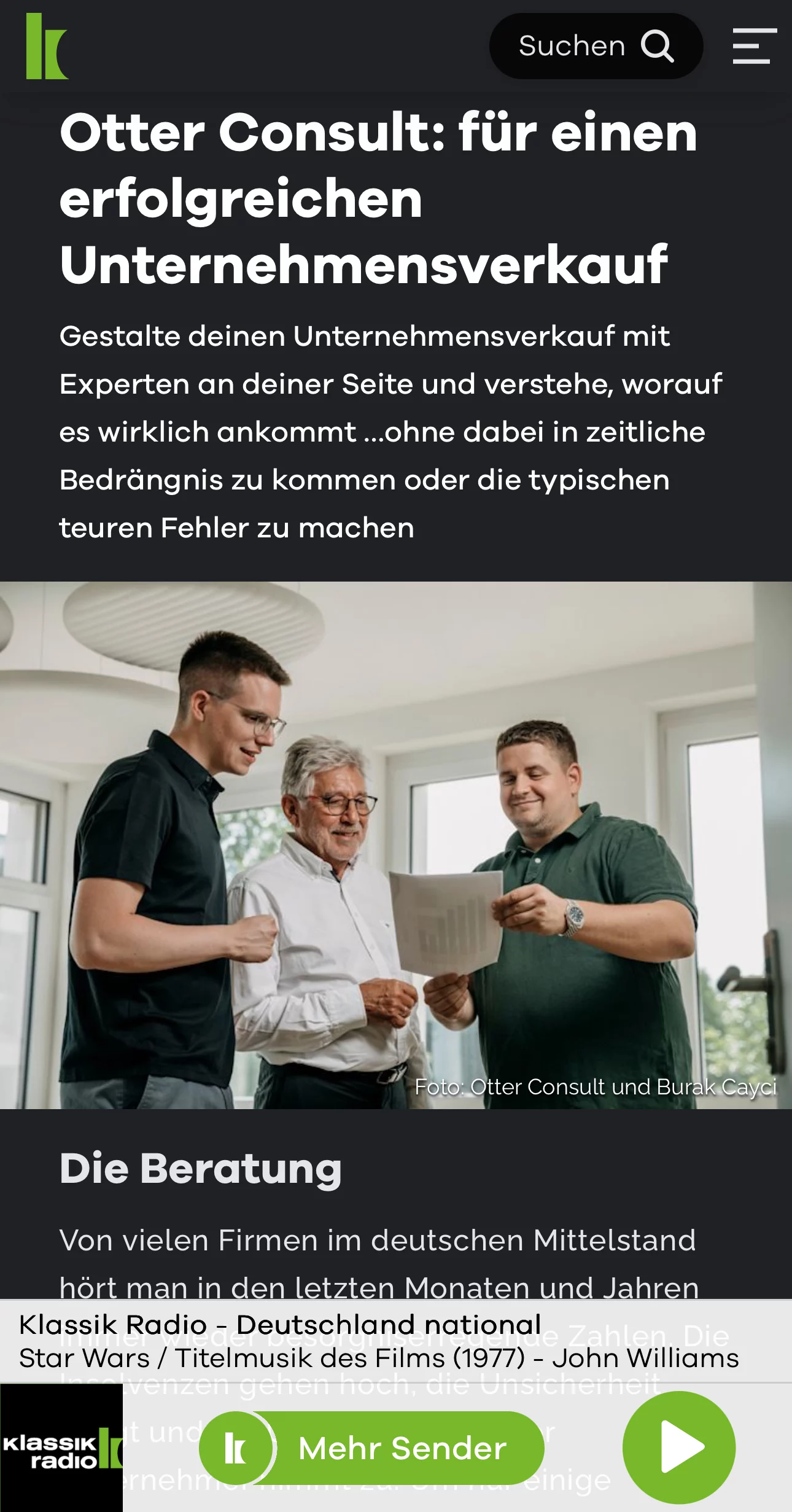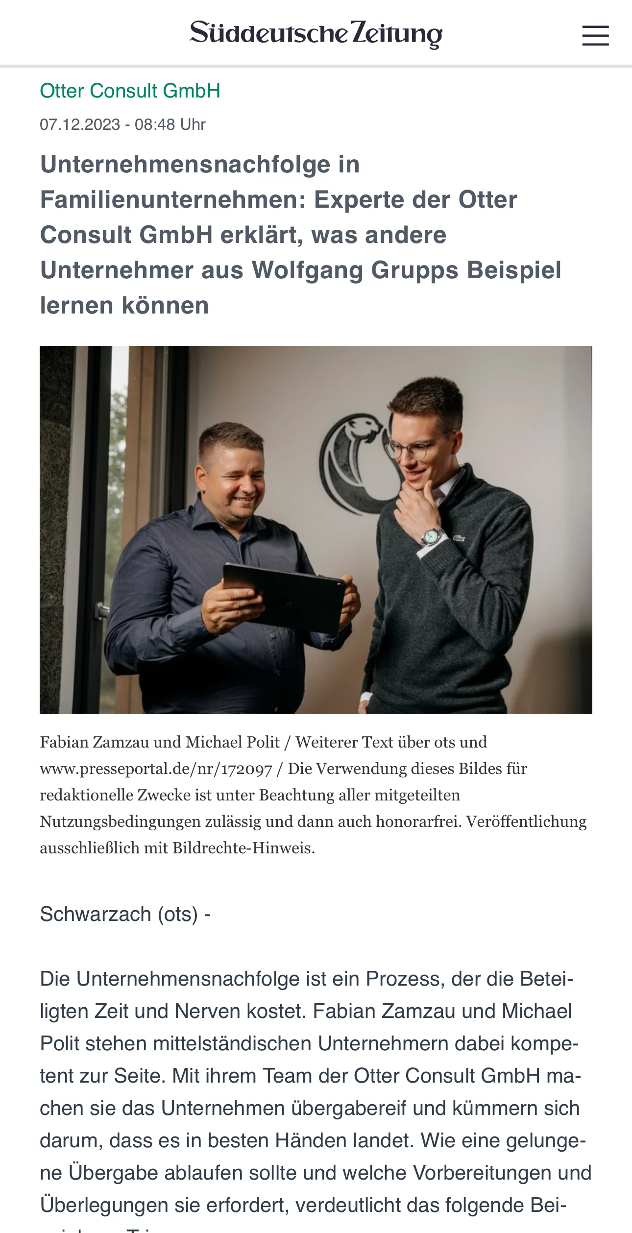 Bei Otter Consult sind wir anerkannte Experten zum Thema Unternehmensverkauf und Unternehmensnachfolge. In verschiedenen Beiträgen (z.B. bei der Süddeutschen Zeitung, dem Münchner Merkur oder der Berliner Morgenpost) haben wir bereits über unsere Mission und unser System gesprochen, welches Unternehmern zur erfolgreichen Transaktion hilft.